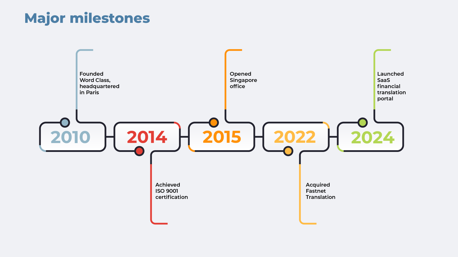 Founded in 2010, Word Class is a bespoke translation agency, actively operating at the forefront of industry developments. We provide best-in-class project management solutions that leverage cutting-edge technology to streamline the publication of multilingual content on a global scale. Our commitment to delivering multilingual quality services was recognized in 2014, when we received our ISO 9001 certification.